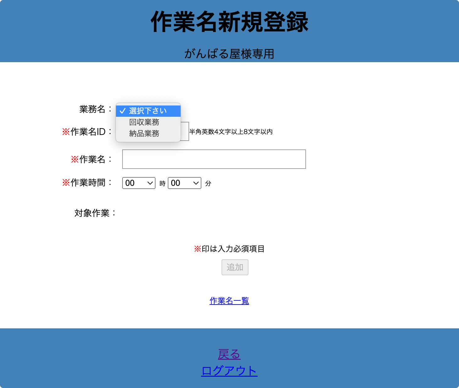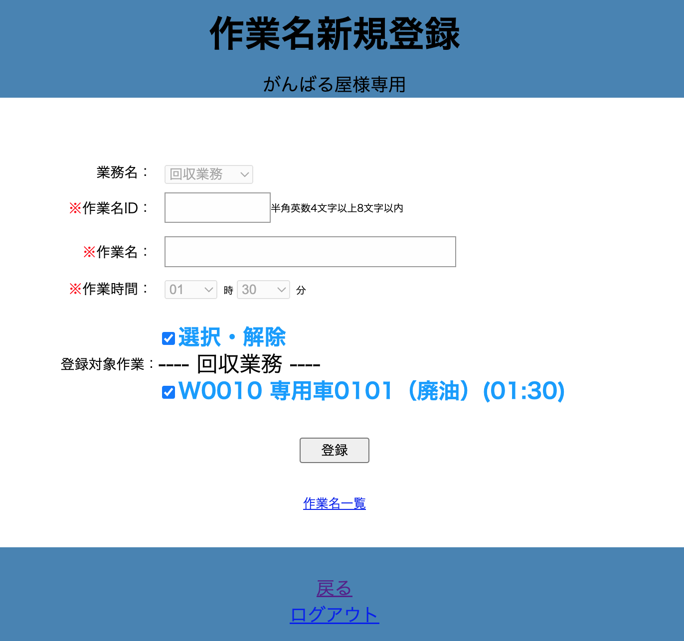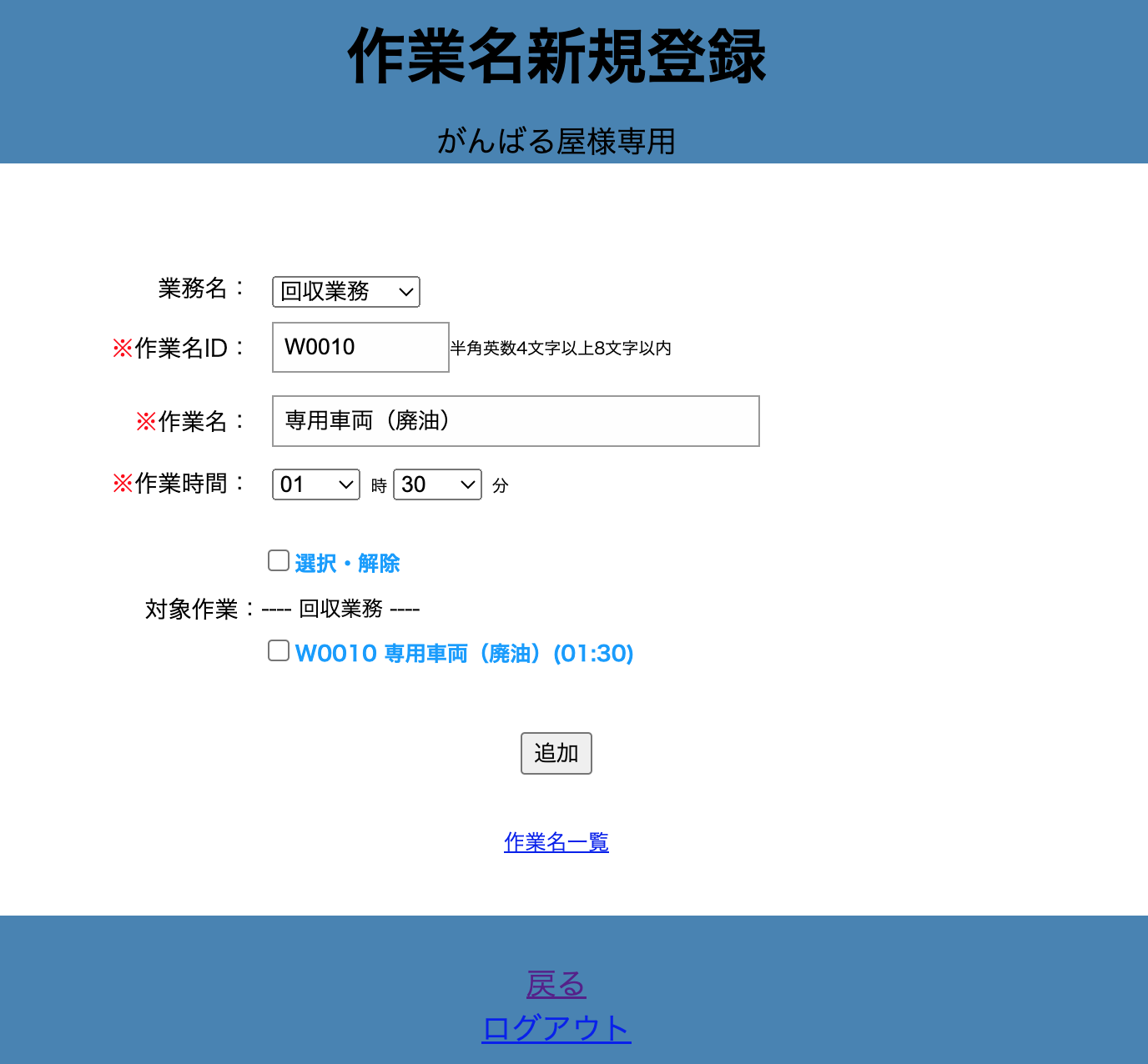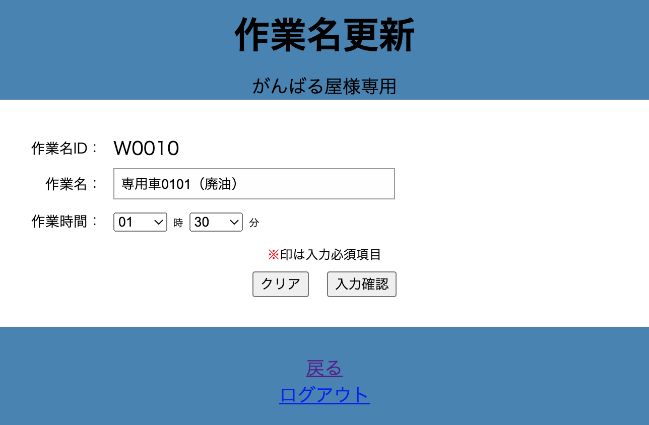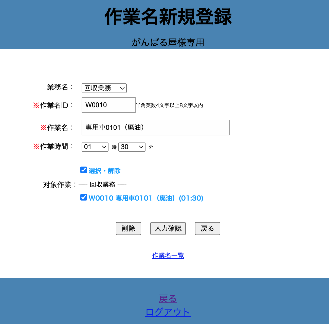 「入力確認」ボタンクリックで、作業リスト確認画面が表示されます。