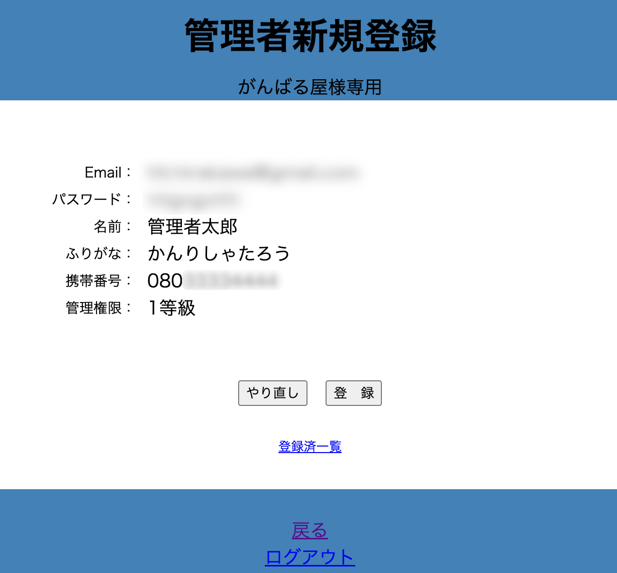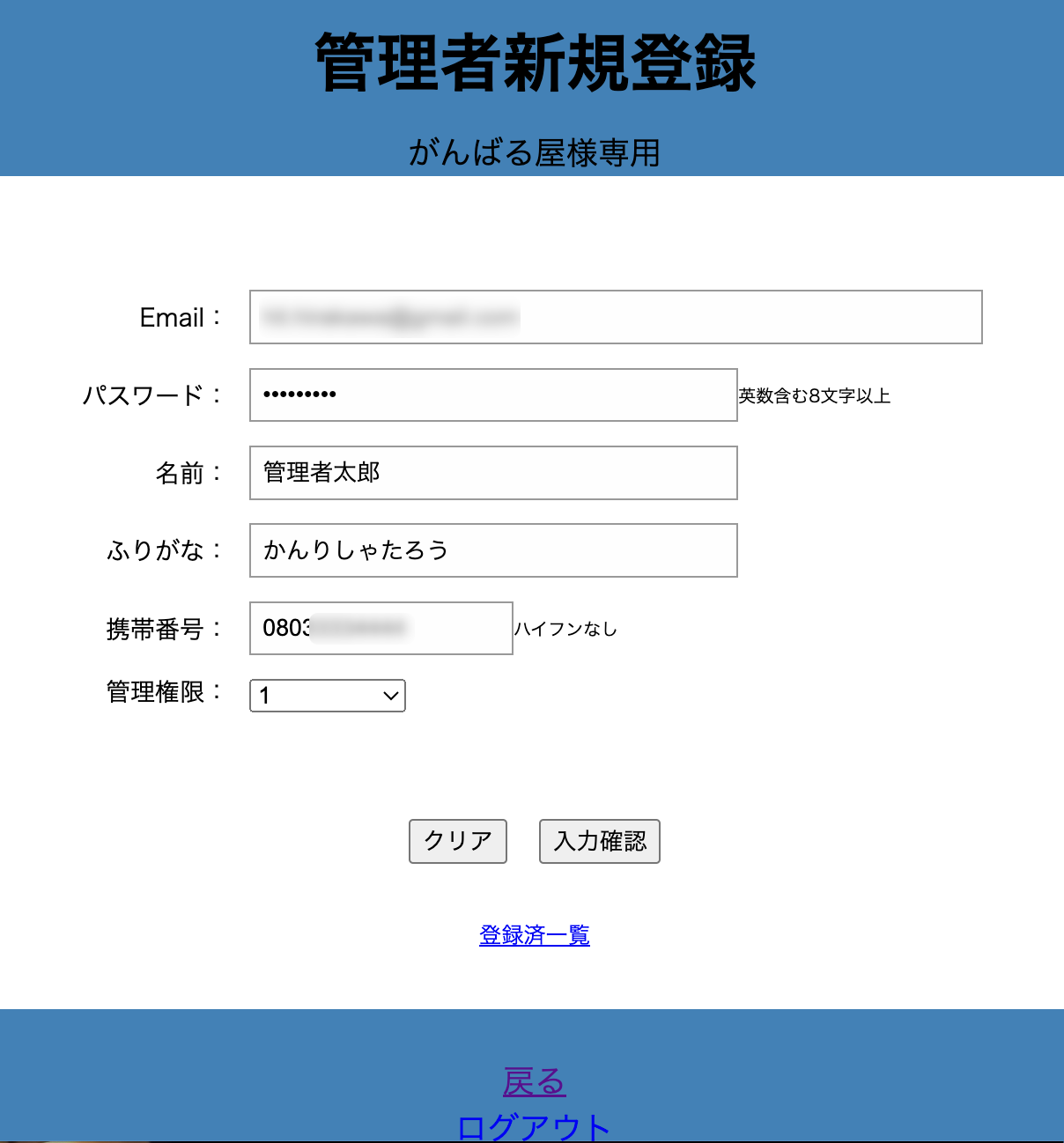 管理者新規登録画面