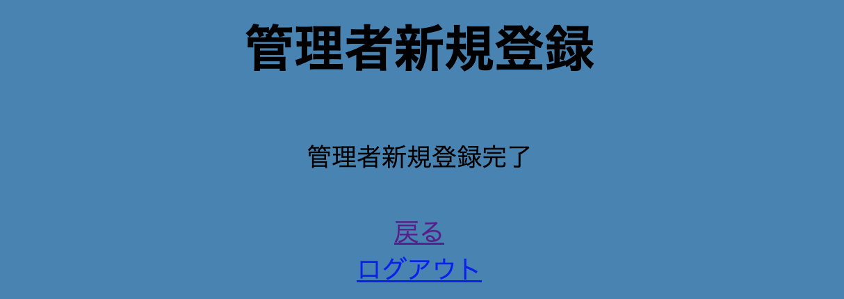 情報が登録されると、管理者新規登録完了メッセージ画面が表示されます。