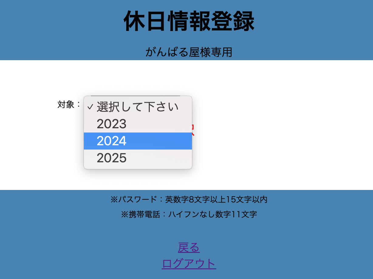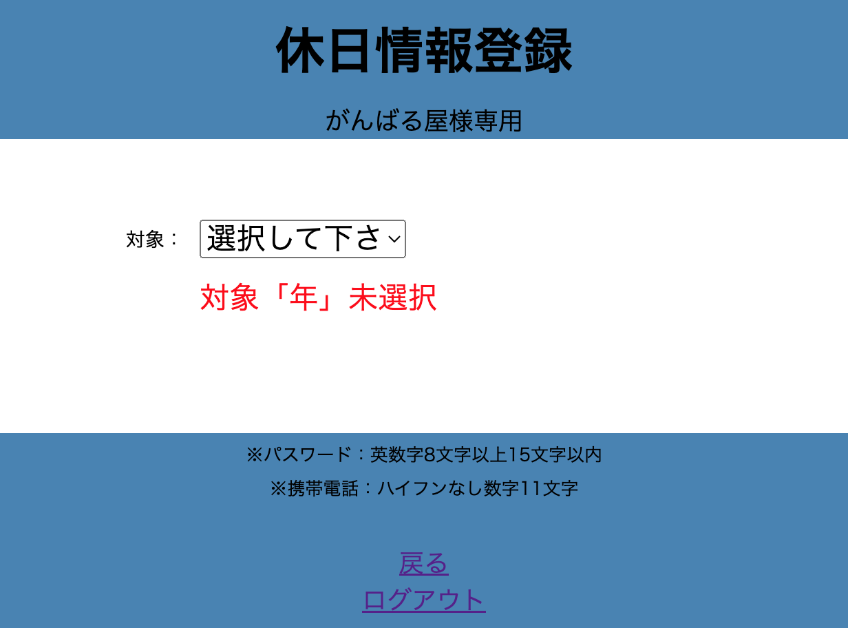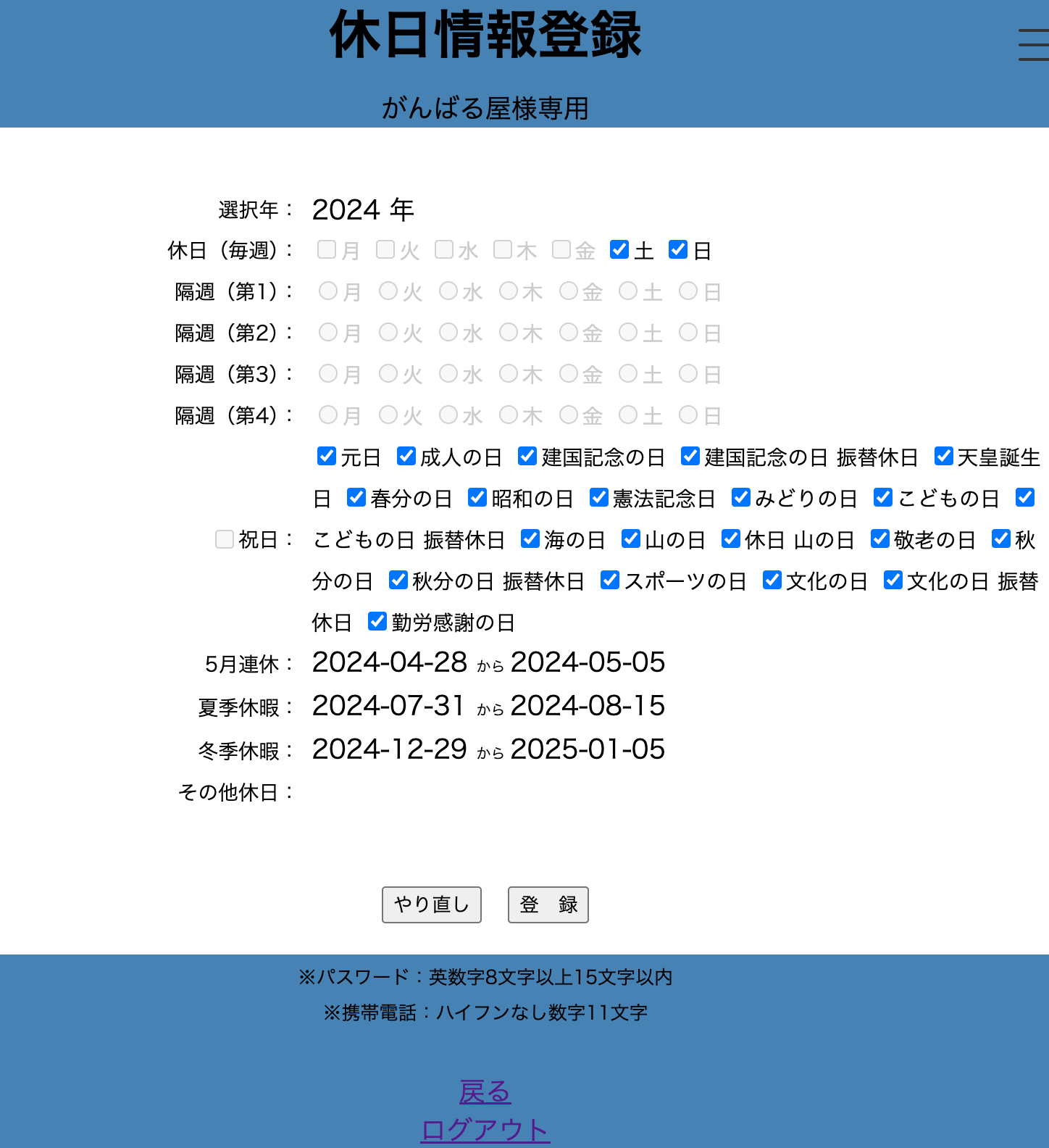 登録された内容は、出退勤集計の休日出勤計算に利用されます。