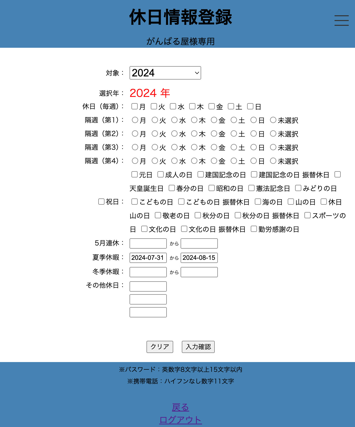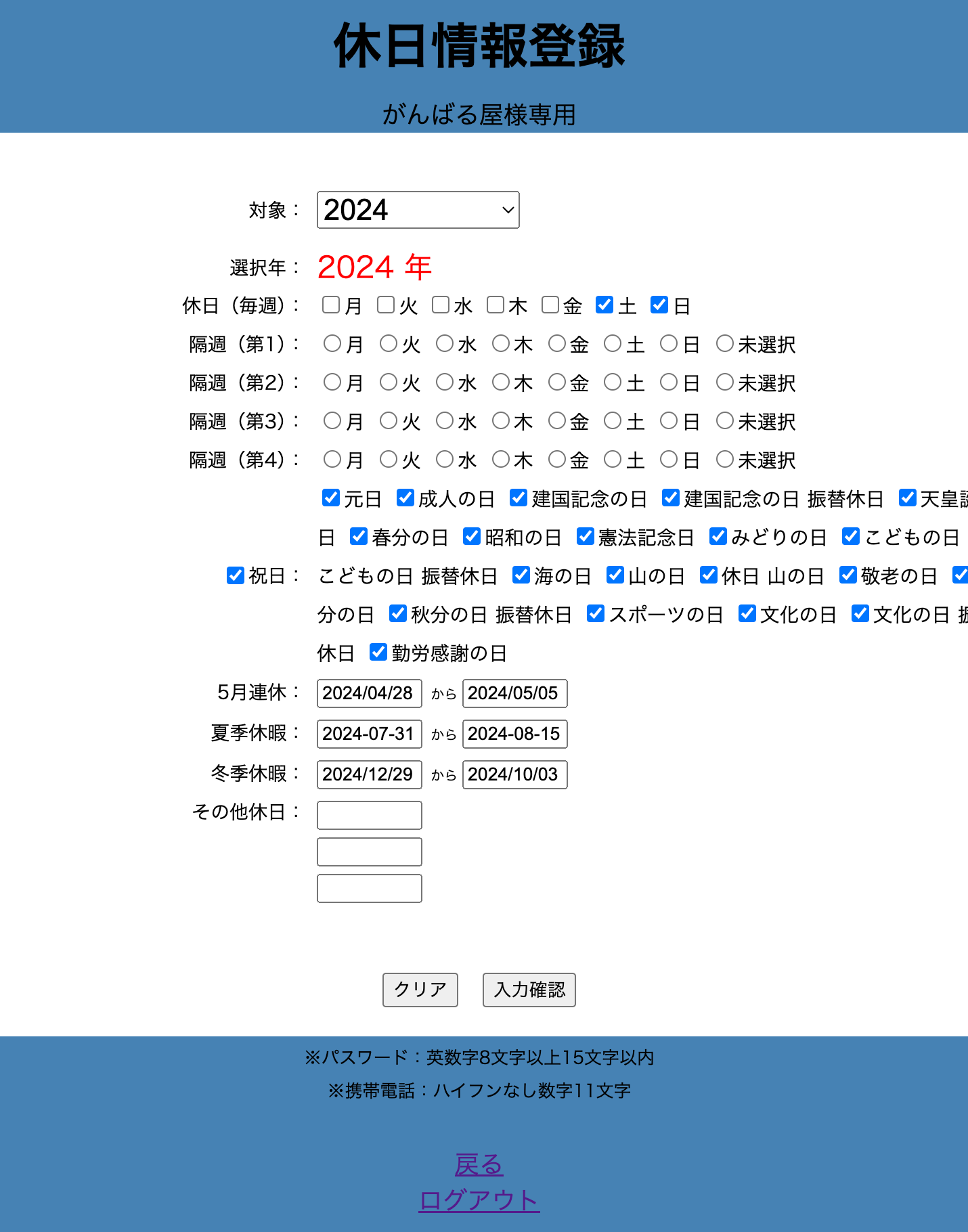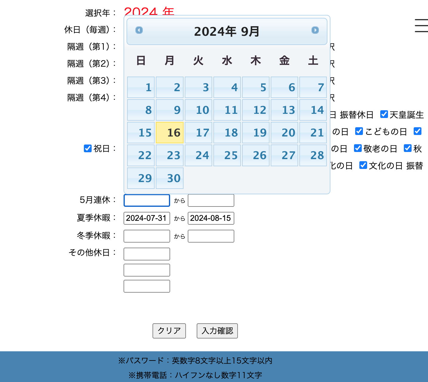 各種休日の入力及び選択が完了後、「入力確認」ボタンをクリックします。