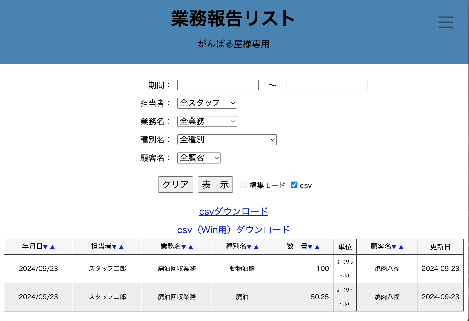 「CSV」をチェックし「表示」ボタンをクリックすると、表示されたデータをCSVファイルでダウンロード出来ます。